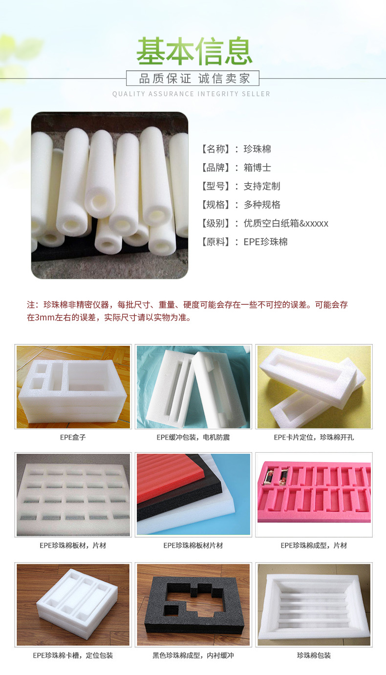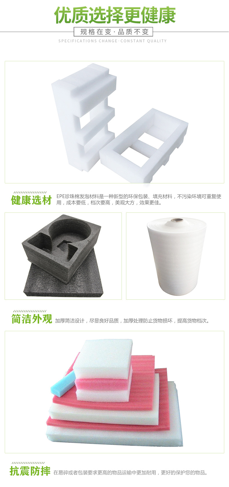 EPE珍珠棉發泡材料是一種新型的環保包裝、填充材料。它的優越特性,越來越被人們認識,因此它的使用將不斷擴大和創新。特別是在包裝和其它工業用材方面,它比傳統的用材性能更好,成本更低,檔次更高,美觀大方,效果更佳。另外它在農副產品包裝用材方面更顯其廣闊天地。